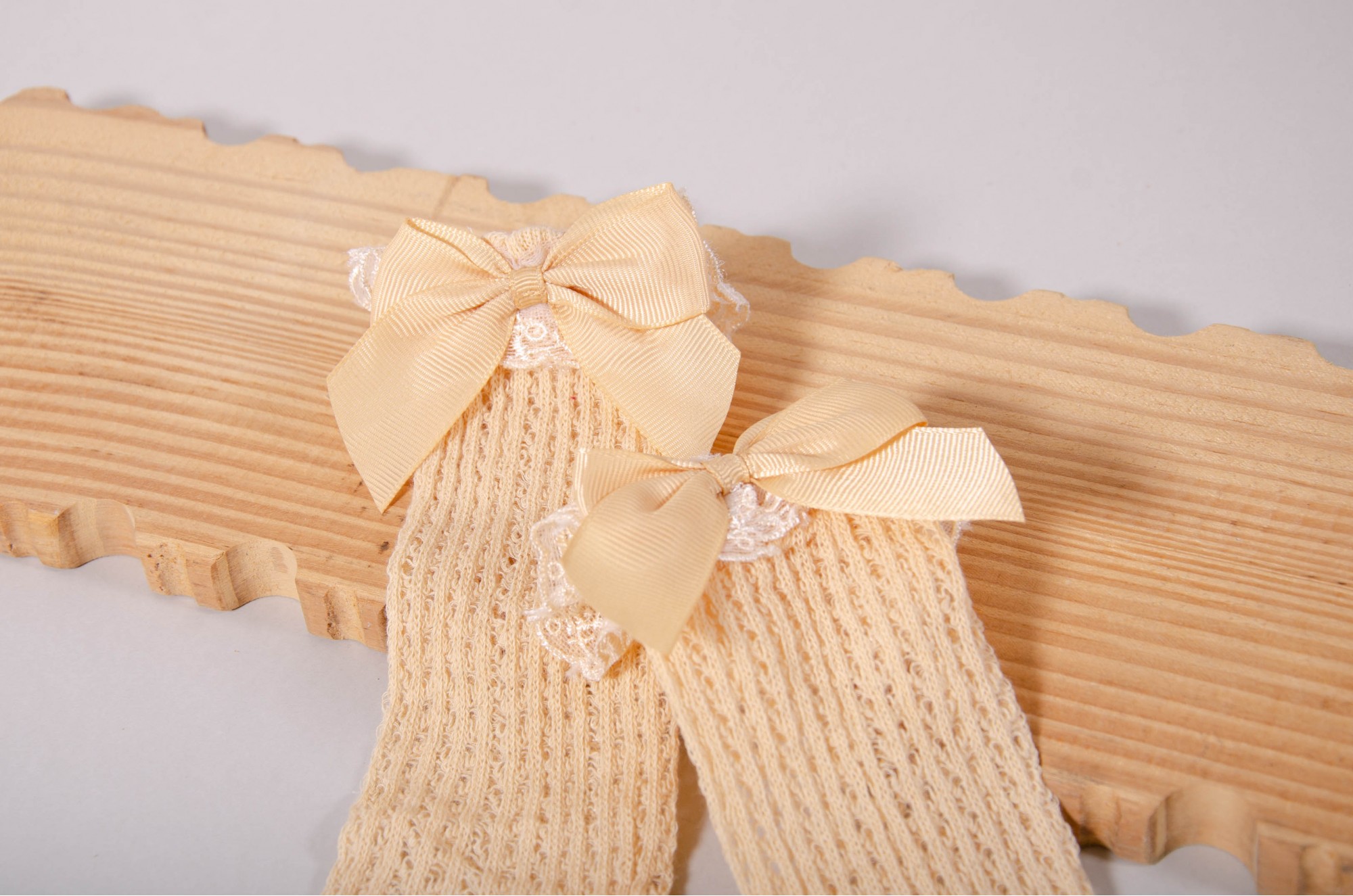 Delicada meia feita em algodão, com detalhes em renda e lacinhos
