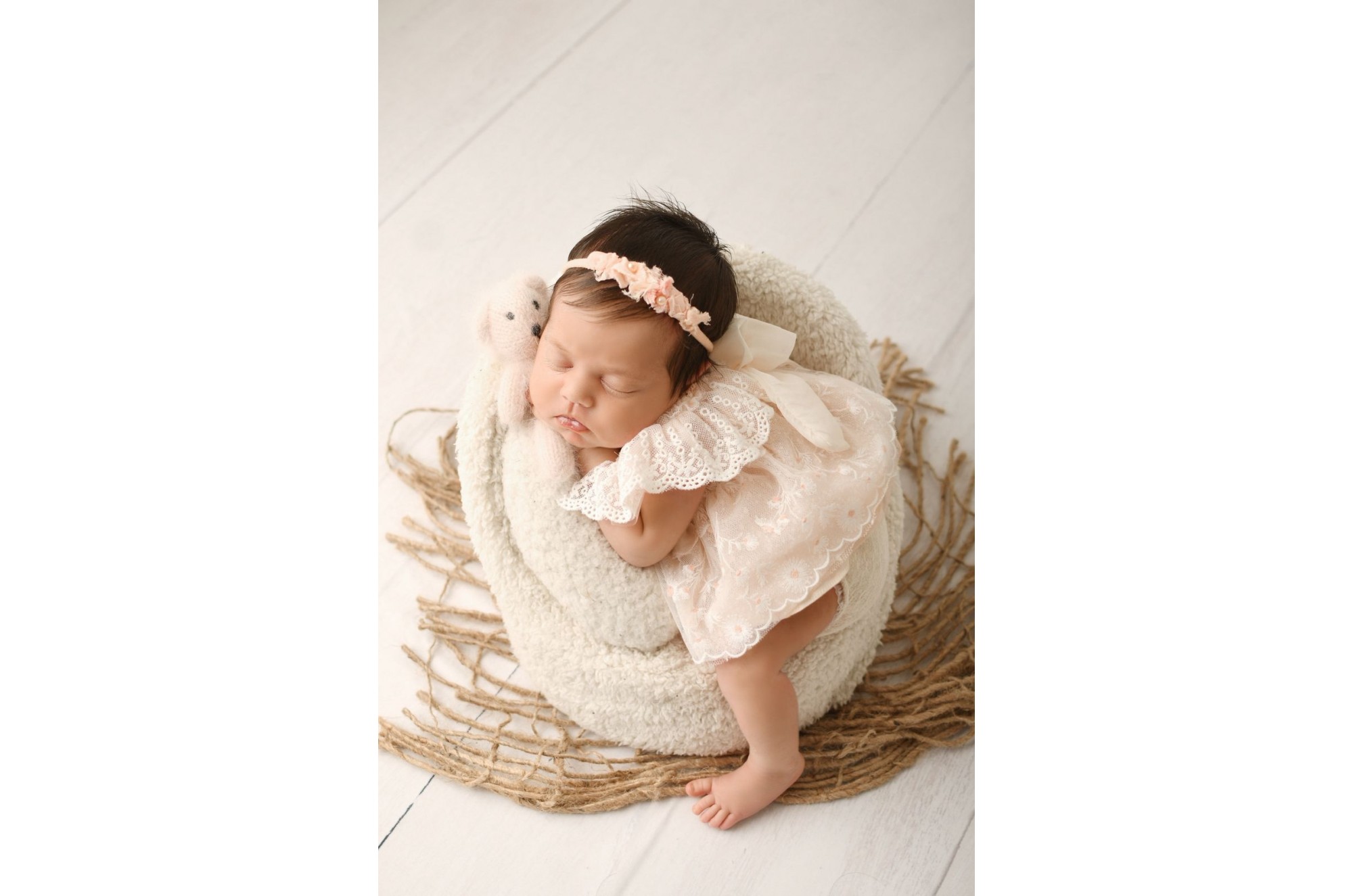 Encantador conjunto de blusa + calcinha para ensaio newborn com modelagem delicada, ideal para compor fotos clássicas e elegantes.