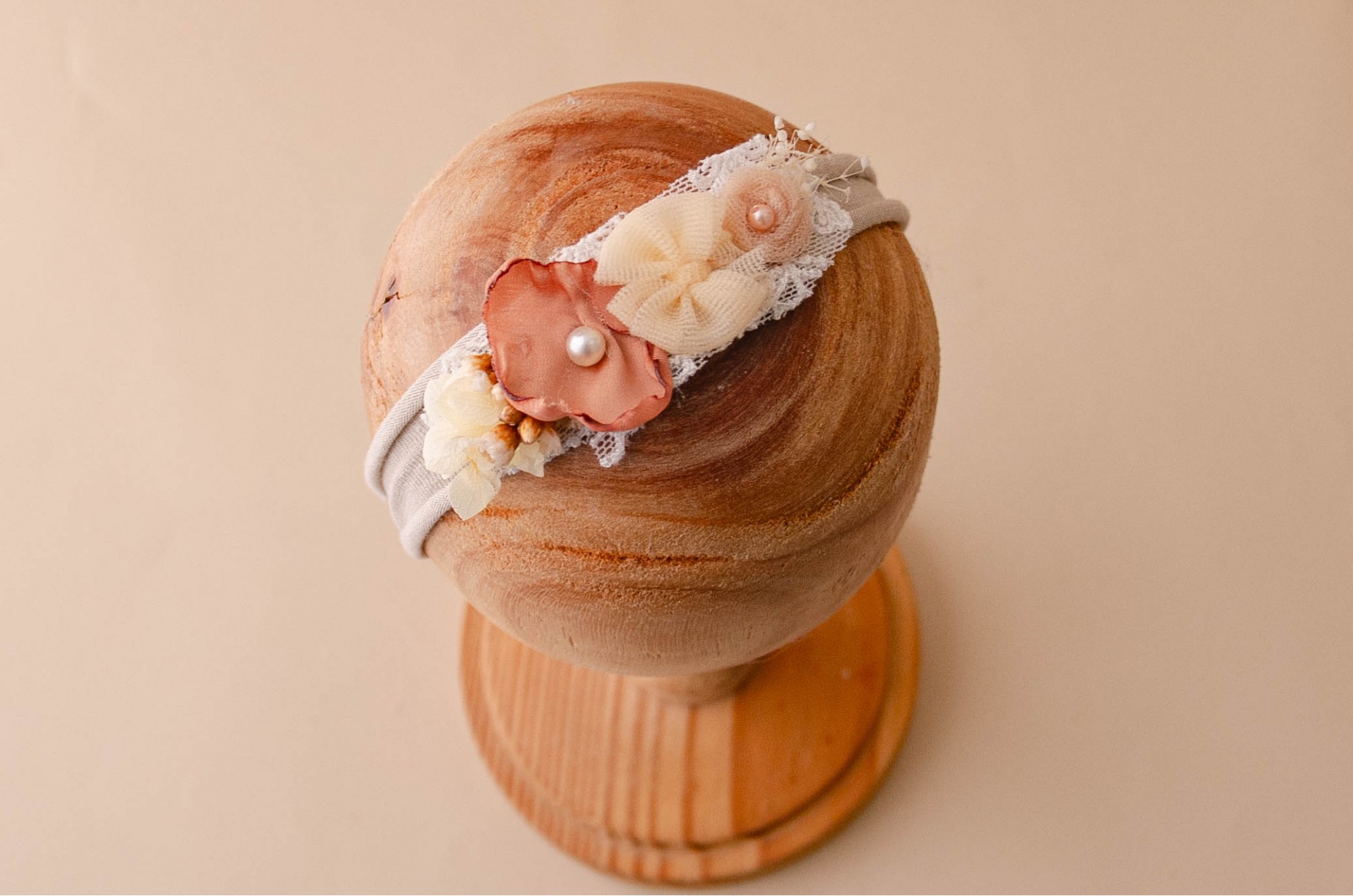 Com detalhes de flores, folhas secas e tecido, compostas de materiais de primeira mão.