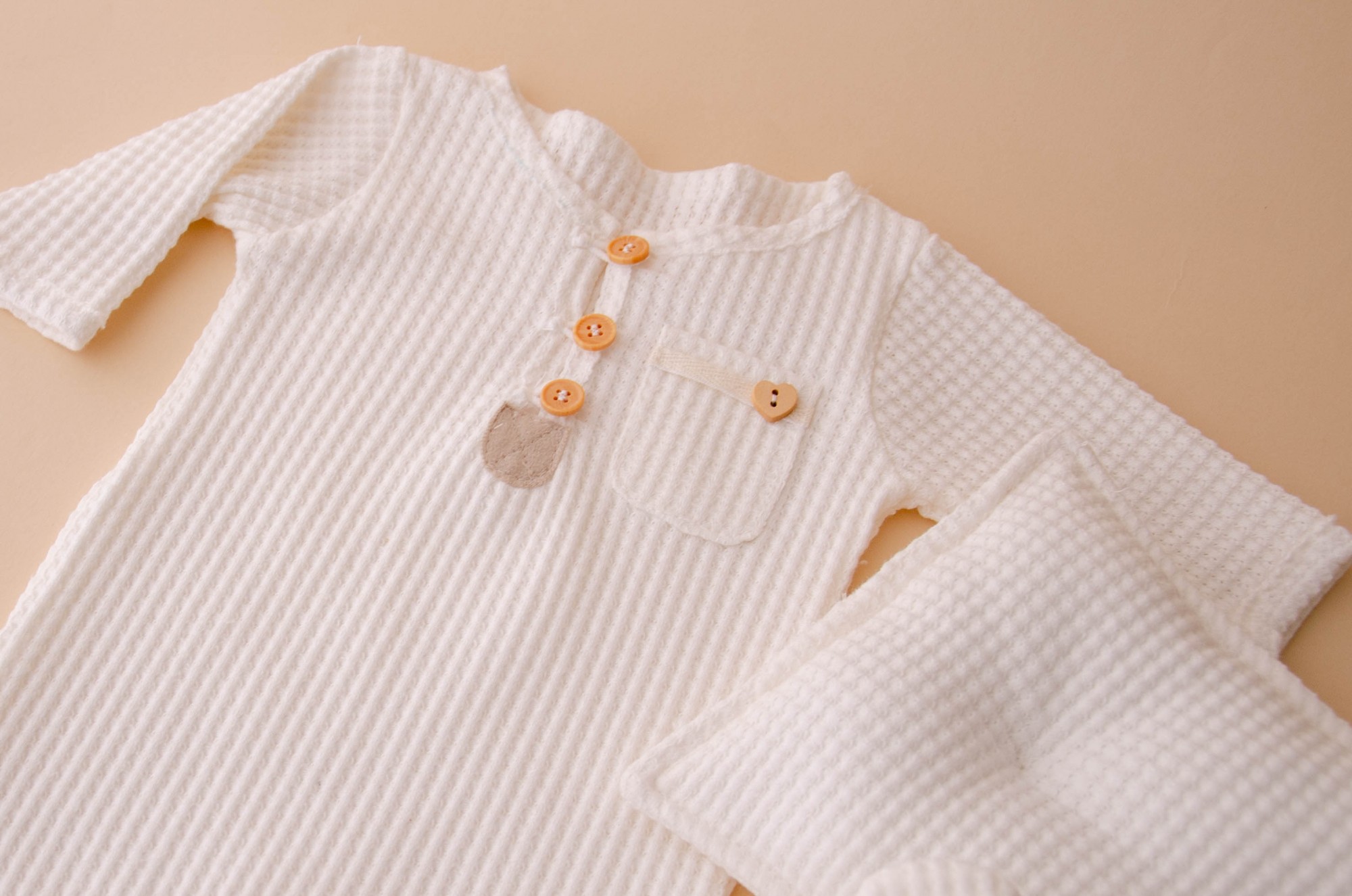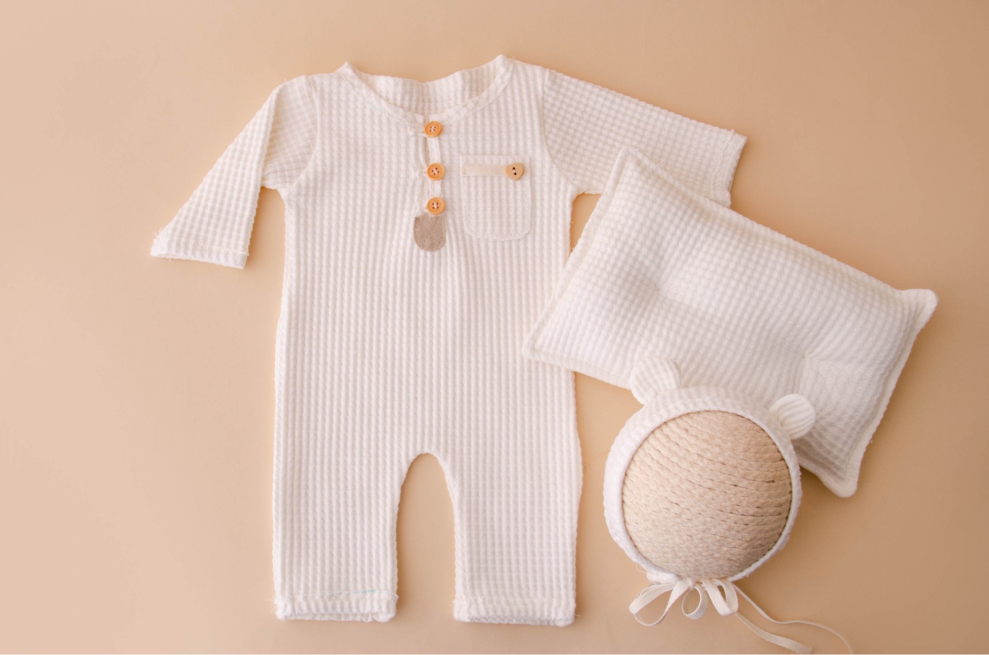 Composto por um macacão, touca e travesseiro