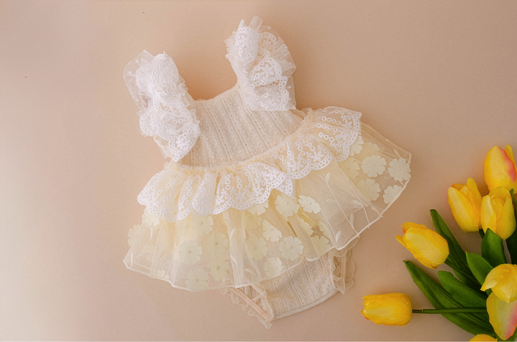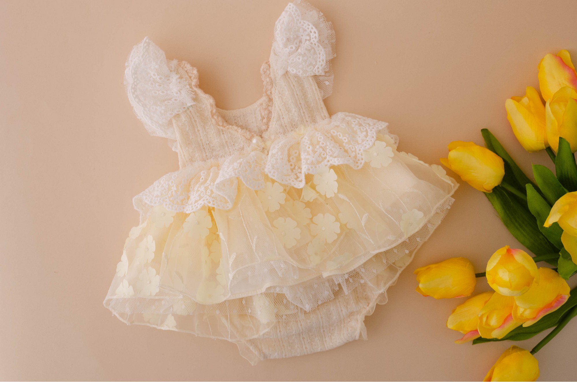 Encantador conjunto de blusa + calcinha para ensaio newborn com modelagem delicada, ideal para compor fotos clássicas e elegantes.