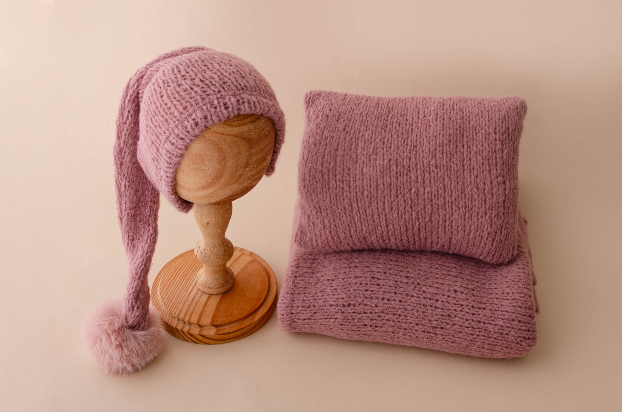 Conjunto aconchegante em tricô: gorro com pompom macio e travesseiro e wrap combinando, perfeitos para trazer charme, conforto e um toque delicado nas fotografias